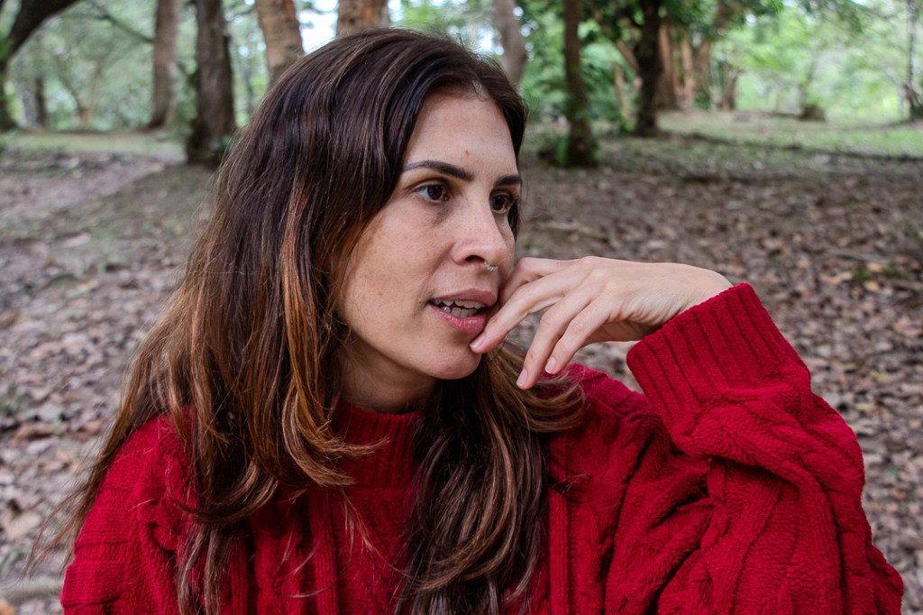 “Eu nunca tinha encabeçado nada, então eu era muito insegura com aquilo: vou cantar como? E aí a gente experimentava, Mateus mandava pra eu ouvir e eu ‘não, não gostei do timbre da voz, quero outro lugar’, sabe? Acho que foi bem importante pra eu criar mais coragem, mas acho que aquilo ali ainda é um lugar bem experimental meu, não é um lugar definido”.