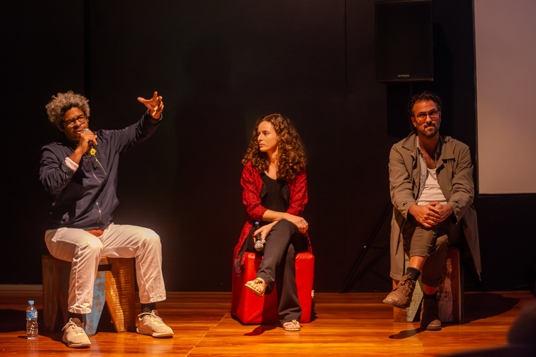 Antes da sala escurecer-se toda e as imagens de Aquele Que Viu O Abismo serem apresentadas na grande tela, Gregorio Gananian e Negro Leo sobem ao palco, são formalmente apresentados e, depois, fazem uma breve conversa mediada por Rafaela Barbieri.