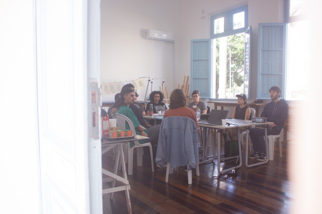 “A outra oficina foi substituída por um encontro que a gente chamou de ‘encontro de editoras e iniciativas editoriais independentes’. Então a gente chamou dois editores: um de uma editora de artes visuais, outro de uma editora de literatura, ambos aqui de Itajaí, com atuação aqui em Itajaí, pra mediar uma conversa sobre o nosso cenário local, em termos de circulação e mercado editorial, e sobre possíveis estratégias que a gente poderia pensar em conjunto.”