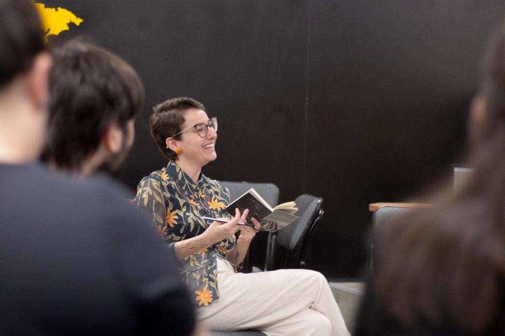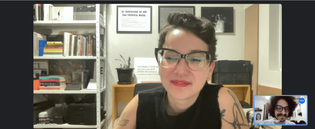 “Eu fiquei bem feliz com o quanto as pessoas da literatura aderiram ao projeto, e aderiram se sentindo muito pertencentes. Eu fiquei com medo que fosse existir esse hiato entre a galera das artes visuais e a galera da literatura, porque realmente tem algumas coisas na produção de livros, coisas assim, que a gente tem uma diferença muito grande, né? Desde os custos de produção, por exemplo, que em geral nas artes visuais a gente tem a questão de projetos gráficos específicos, enfim, é quase um negócio forma versus conteúdo em alguns lugares. Mas a galera da literatura pegou junto. Eu também percebi algumas pessoas das artes visuais que não trabalham necessariamente com publicação, mas que vieram interessadas na pesquisa da galera que veio, né?”