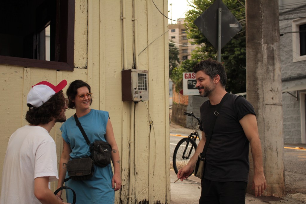 “Eu fico pensando num cenário onde a gente chamasse uma equipe de fora. Tecnicamente, o filme poderia ter tido um caminho muito mais, sei lá, talvez tivesse imagens estáveis, seria outra ligação. Mas talvez perdesse uma coisa que é muito importante que é a vivência da bodega, né? Que nós todos somos bodegueiros no sentido de viver isso sempre, então a gente queria que isso acontecesse. E óbvio que eu não tô romantizando uma equipe de cinema quando eu falo em coletividade, porque sem hierarquia as coisas não funcionam. Então, embora a gente tivesse pensando tudo coletivamente, cada um sabia suas tarefas exatamente, por escrito inclusive, impressas! E funcionou porque todo mundo tirou a ideia de protagonista, de autoria e de ego intelectual disso. A nossa ideia era fazer um filme, aí todo mundo dedicou o que podia pra que a coisa acontecesse da melhor maneira. Acho que isso que é o mais bonito, sabe? A gente não tava filmando em 4K, porque não é importante o 4K pra gente, a gente também queria talvez uma sujeira, a gente queria outras coisas. O filme tem um pique muito das coisas acontecendo e acho que é muito a nossa visão do rolê, quando os olhos começam a ficar bêbados, quando as coisas começam a acontecer, quando tudo vira uma grande confusão, mas volta e tem uma reflexão que parece super simples, mas é extremamente filosófica porque é uma fala de alguém que tá na bodega, enfim. Então eu acho que só funcionou como uma equipe coletiva porque a gente abriu mão do ego e das ideias de protagonismo da gente como artista.”